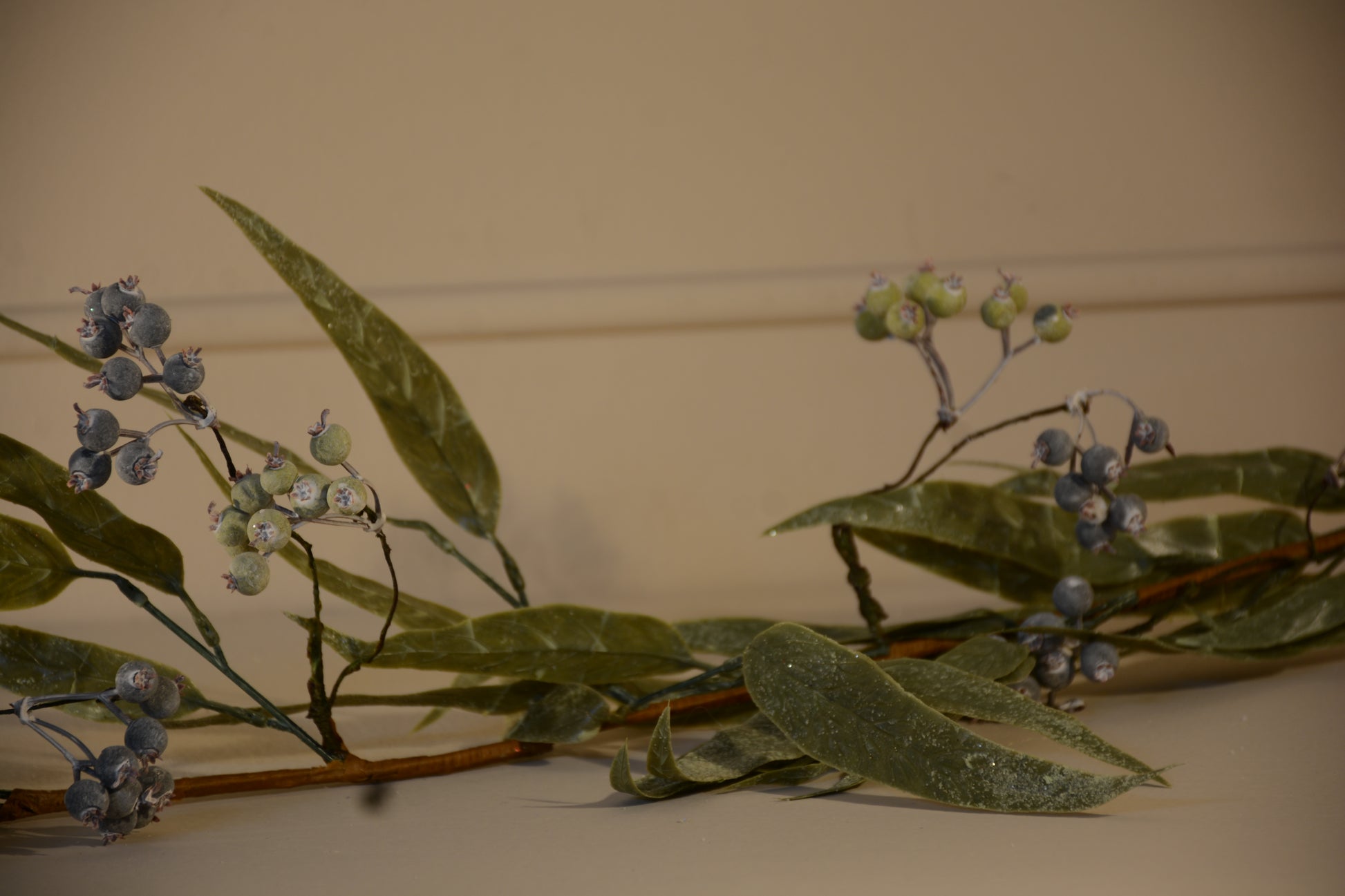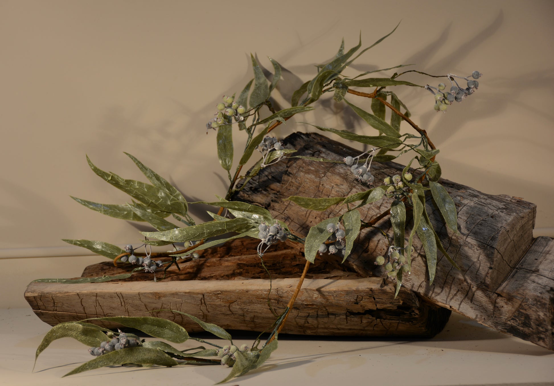 Una pieza elegante y natural que aporta frescura a tu decoración navideña. Elaborada con hojas alargadas de eucalipto en tonos verdes realistas y pequeños frutos en acabado escarchado que evocan el invierno, esta guía es perfecta para adornar mesas, repisas, puertas o rodear tus centros de mesa.