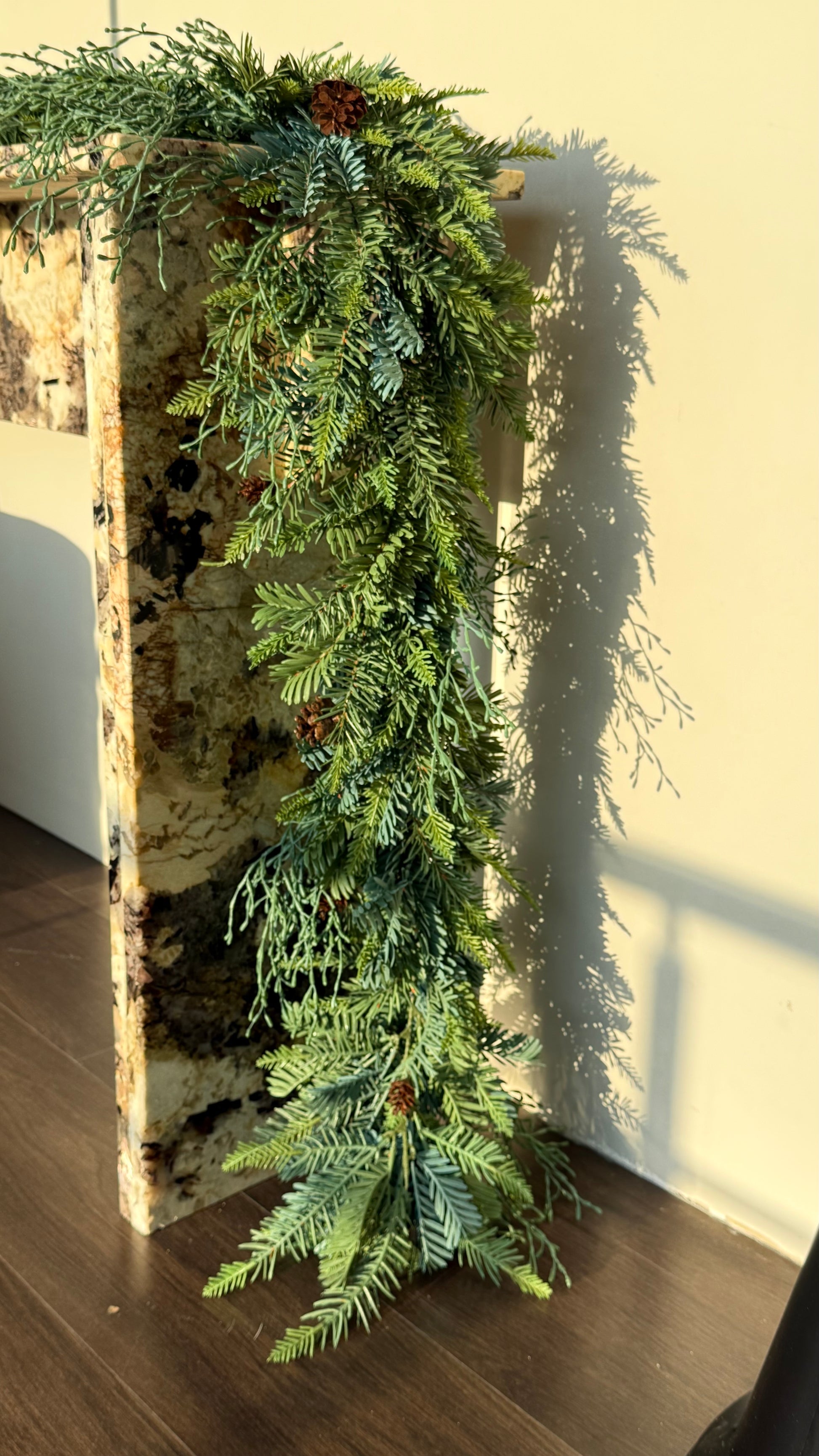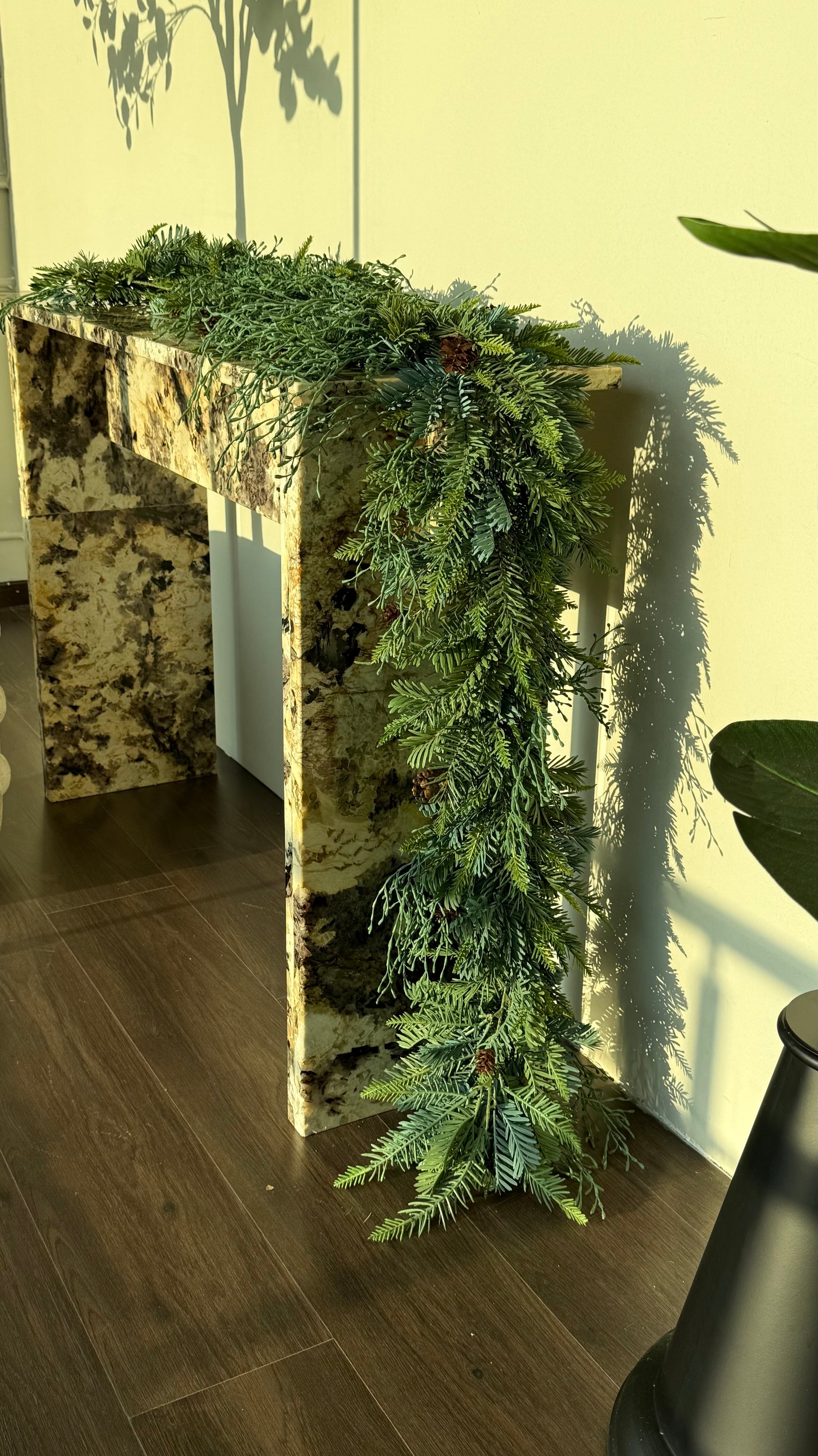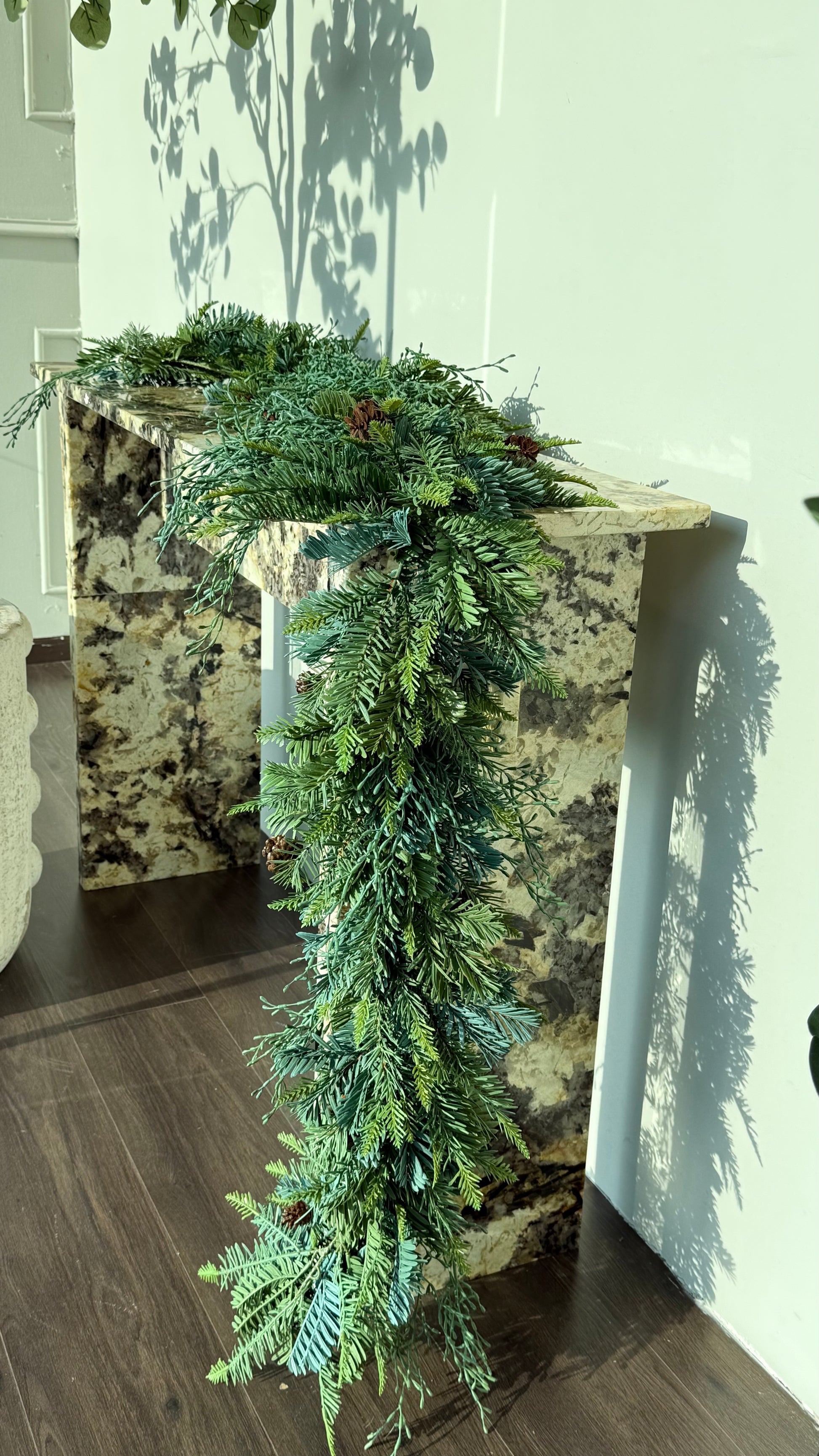 Agrega un toque natural y elegante a tu decoración con esta hermosa guía navideña de 180 cm de largo, elaborada con 3 tipos de follaje mixto que le dan un aspecto fresco, abundante y realista.