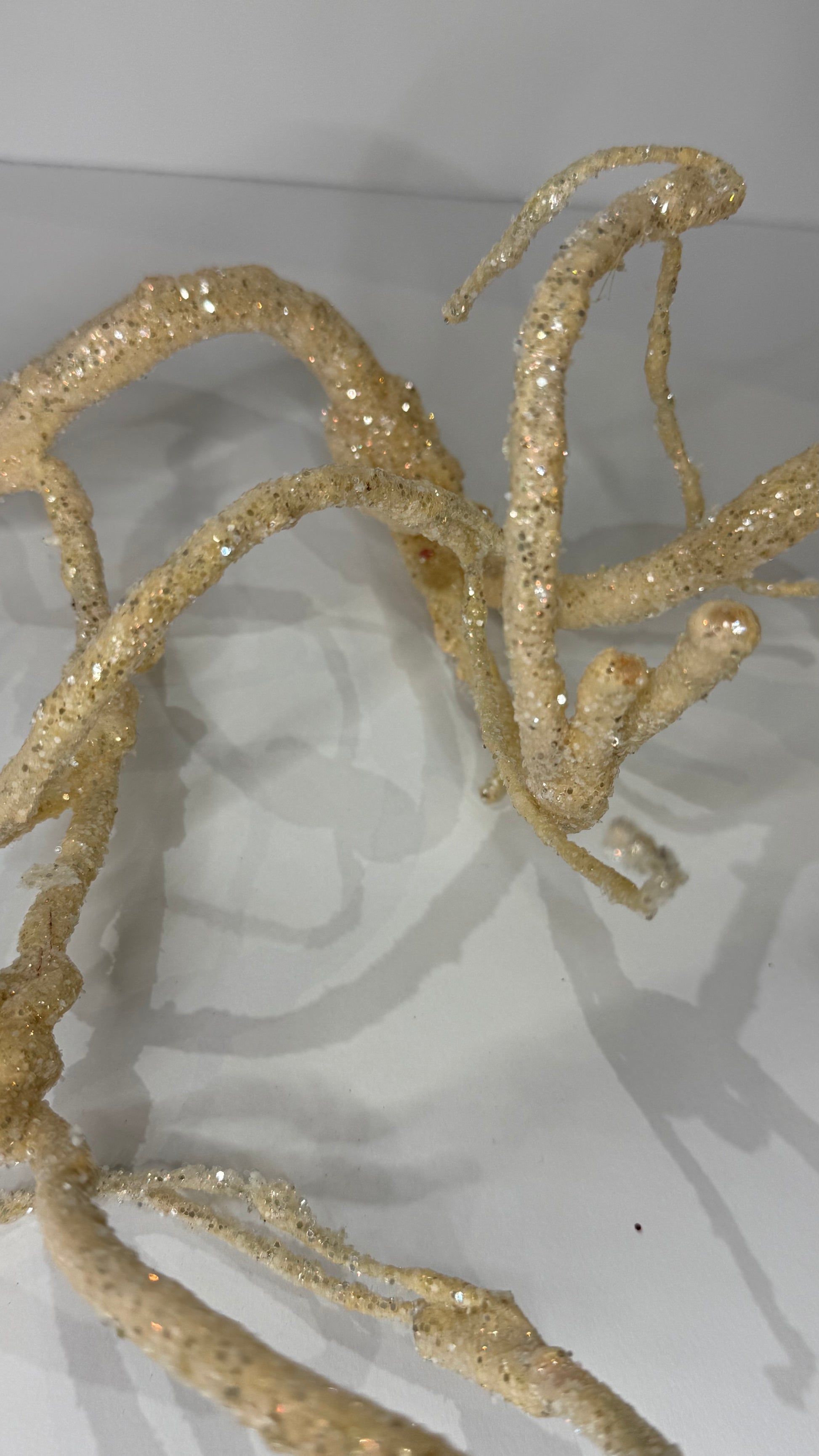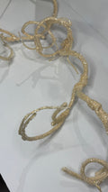 Elegante rama de diseño retorcido en tono marfil, recubierta con un delicado acabado de glitter dorado que aporta brillo y sofisticación. Ideal para complementar arreglos florales, coronas, guías o para dar un toque resplandeciente a tu árbol de Navidad. Su textura y forma orgánica generan un efecto moderno y llamativo, perfecto para crear ambientes festivos llenos de luz y estilo. 70 cm